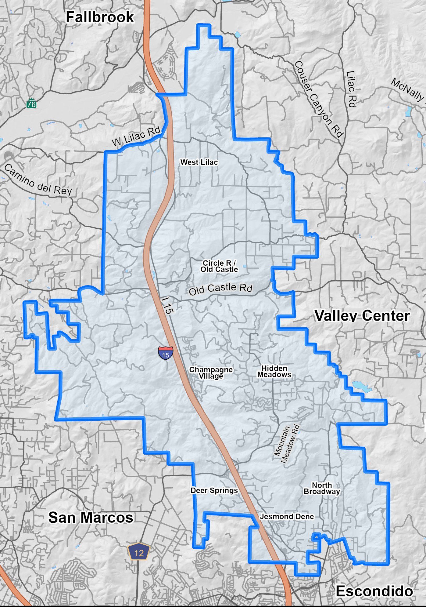 The Deer Springs Fire Protection District is located in San Diego's inland north county and serves an area of 47 square miles providing fire and emergency medical services to approximately 13,000 residents. Most of the residents reside in the Hidden Meadows, Jesmond Dene, and Castle Creek areas, or within one of two prominent mobile/manufactured home communities. These communities consist of predominantly single-family residences. The District includes the Welk Resort and Time Share facilities, which houses a large number of visitors year-round. The majority of District residents live on or near the wildland-urban interface. The northern section of the District consists of thousands of acres producing income from avocados, citrus, and other agricultural activities.